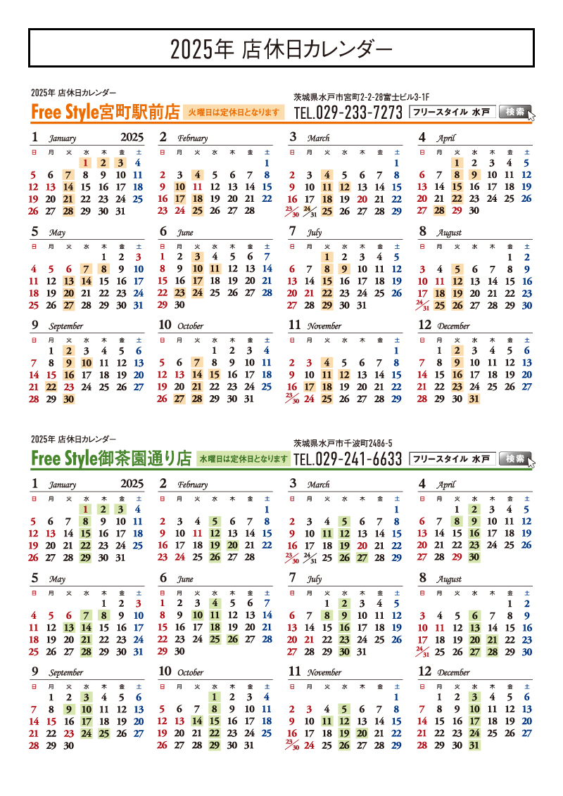 いつも美容室フリースタイルをご利用いただきましてありがとうございます。この度、フリースタイル2025年の店休日カレンダーを更新いたしました。2025年店休日カレンダー・宮町駅前店の店休日: 火曜日・御茶園通り店の店休日: 水曜日となっております。ご来店の際は、お気を付けくださいませ。2025年もお引き立てよろしくお願いいたします。